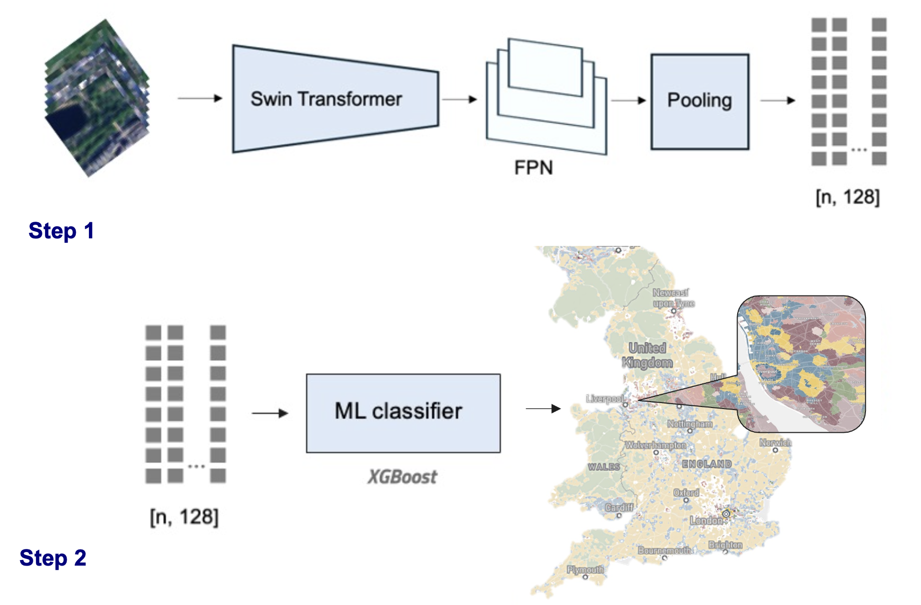 Training the AI vision model on the outputs from step one, to fill data gaps and to produce a temporal classification based on historical satellite data.